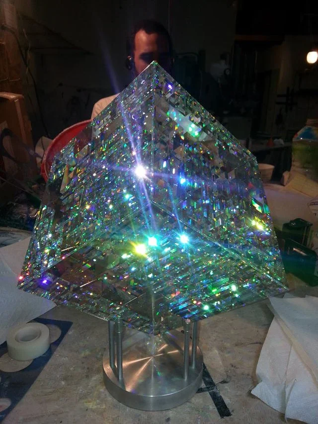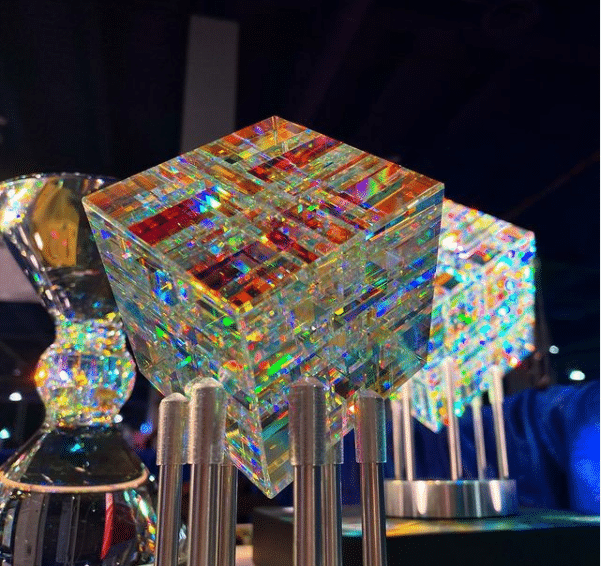 This piece is composed of 8 small 5″ triple cut Magik Chroma Cubes laminated together and it comes with a motorized 42″ tall stainless steal base.Limited Collection Size: 100 pieces